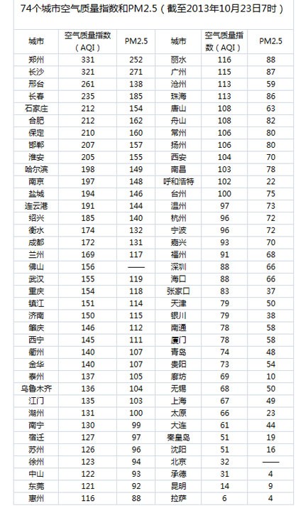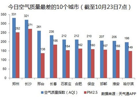 人民网北京10月23日电(杨翼 蒋琪)截至今天早上7点,郑州的PM2.5达到252,AQI数值为331。昨日,相同时间郑州AQI数值为262。22日、23日郑州两次入围全国空气最差前十城市。
