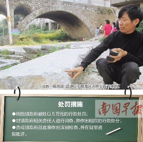对此,周鹿镇党委书记解释,古桥被拆系意外,且在拆除古桥时,镇政府不知该古桥是文物。南国早报记者了解到,目前,该镇因损毁文物已被作出相应处罚