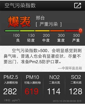 上图为天气通APP上午6时更新的最新空气污染指数数据,邢台PM10指数高达619