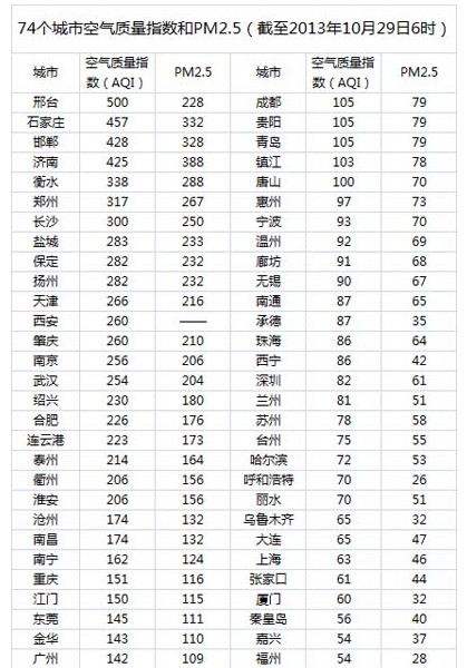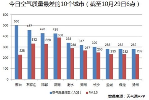 截至今天早上6点,邢台的AQI达到500,PM2.5数值为228,成为74个公布PM2.5数据城市中空气质量最差的城市。今日空气质量最差10个城市分别是:邢台、石家庄、邯郸、济南、衡水、郑州、长沙、盐城、保定、扬州。其中邢台、石家庄、邯郸、衡水、保定等5个属于河北省。截止今天早上6点,邢台的PM10已达619,空气污染指数“爆表”。