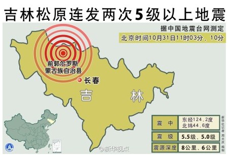 据吉林省人民政府新闻办公室官方微博消息,吉林省地震台网测定,2013年10月31日11时03分和10分在吉林省松原市前郭尔罗斯蒙古族自治县分别发生5.5和5.0级地震,震源深度分别为8千米和6千米。截止10月31日17时,地震造成12人受轻伤,已及时送到医院进行救治。目前,灾情还在进一步核查中。