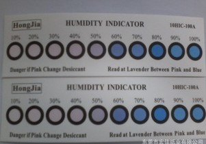 型号:3HIC-3050A用途、适用行业:用于PCB等电子元器件的包装品牌:宏佳加工定制:是 一、产品介绍大部分的电子元器件、精密光学部件等高端电子、仪器设备容易受到湿气的影响导致产品锈蚀、灵敏度降低甚至导致不可恢复的损坏。为避免产品受到湿气的侵蚀及损坏,大部分产品会采用防潮包装组合,在最后成品及半成品的包装阶段对产品进行保护,而湿度指示卡就是便捷、经济的检测湿度是否在受控范围的物料,当打开密封袋,湿度卡上的颜色显示读出的数据就可以作为监察密封包装内的湿度是否在规定的湿度范围之内的依据,同时,也能间接反映出密封包装内的干燥剂是否发挥吸潮效果。湿度指示卡(Humidity Indicator Cards)又称湿度卡、防潮标签、防潮卡.是用来显示密封空间湿度状况的卡片,是检测在密闭包装内的相对湿度是否安全的一种环境测量产品。圆圈上方或侧方的百分率数据是对应圆圈指示的相对湿度数据. 1、 有钴湿度卡(蓝色变粉红)如果包装中的湿度到了或者超过该湿度值的话,卡片上的点就会从蓝色变成粉红色,立即可知包装容器的密封状况或干燥剂是失效,或湿度已达或超过不能保存物品的程度。湿度卡是可逆变化的,湿度超过对应的湿度值,颜色从蓝色变到红色,如果湿度低于对应的湿度值,已经变粉红色的湿度卡可以变回蓝色,只是从粉红变化回蓝色需要更长的时间,更需要足够的的干燥剂来使湿度卡恢复蓝色状态。 二、主要应用行业半导体以及IC/集成/线路板(PCB)、电子元器件包装、敏感组件、有机材料、军需品、光学仪器、金属材料、复合材料、医药、仓储及各类真空包装。 三、产品特点1.本公司湿度卡采用独家无硫纸,对其包装的电子产品无腐蚀、氧化,不影响所包装产品的性能2.使用方便、易于观察、快速判定湿度值3.湿度指示范围大(有钴:RH10%到RH100%无钴:RH10%到RH85%)4.湿度指示灵敏度高,在相关温度下的±5%5.可重复使用(烘干后再次使用)四、国内/国际质量标准1.GJB2494-95(中华人民共和国军用标准)2.MIL-I-8835A(美国军用包装标准) 五、使用说明及储存1.当环境的湿度达到或湿度指示卡上指示点标注数值的时候,该指示点会从干燥色变成吸湿色。2.环境的湿度降低时,指示卡的点的颜色会从吸湿色重新变回干燥色。3.当指示点的颜色变成指定色的时候,该点中的数值就是当前环境的湿度值。4.在使用湿度指示卡时,手不能直接接触指示圈。5.请按使用数量取用,避免长时间(30秒)暴露在空气中,如没有使用完而变色,请烘干后再使用(用烘干箱烘干,烘至完全变回蓝色)。6.将湿度指示卡密闭保存在原始包装铁罐中,并放入干燥剂,开启3次铁罐以后请更换干燥剂。7.保存在干燥、阴凉的环境中;避免阳光直射和水浸。8.内包装为密封袋和金属罐,外包装为纸箱。9.根据使用数量取用,最好备用一台小型烘干箱,保证湿度指示卡在使用过程中为热包装,这样就可以避免湿度指示卡在使