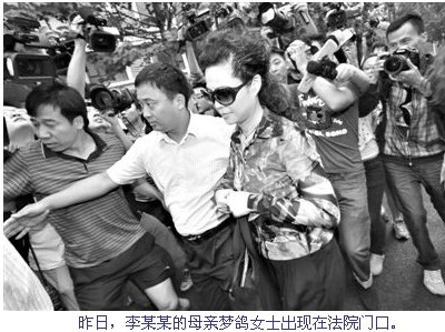 约20分钟后,李某某的母亲梦鸽,在安保人员的陪同下出现在海淀法院南门安检大厅。在场逾百家媒体扛着“长枪短炮”冲上前,均被在场警察拦下,梦鸽也未接受采访。接受完安检后,梦鸽在法院工作人员的指引下进入法院二层17法庭。