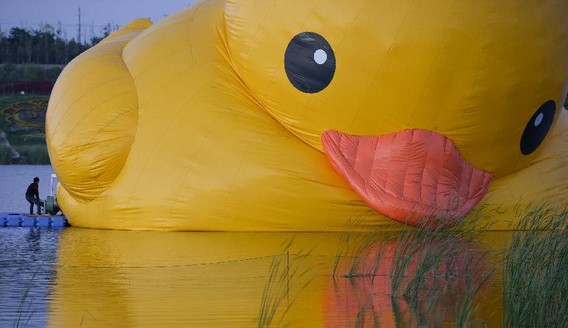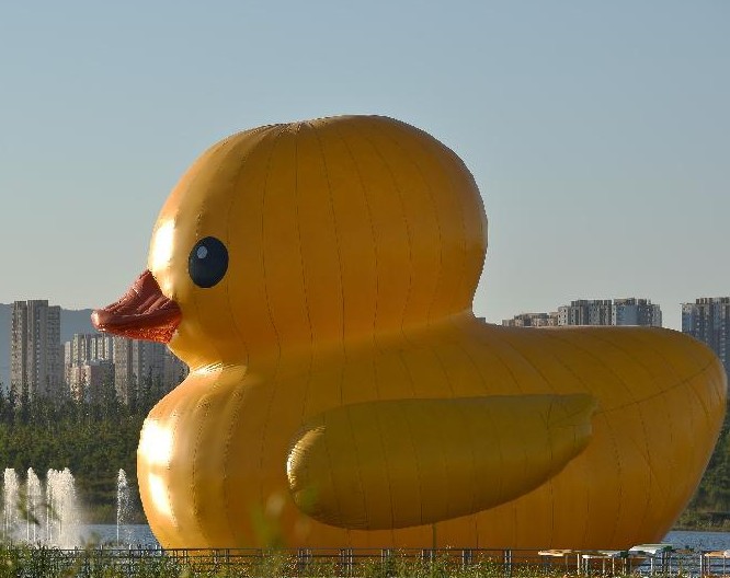 24日下午,大黄鸭初次“下水”昆明湖进行塑料外层与底盘固定,25日晚充气,26日晨将和游人见面。同时,园博园的大黄鸭将被撤下,作为备用鸭存放。