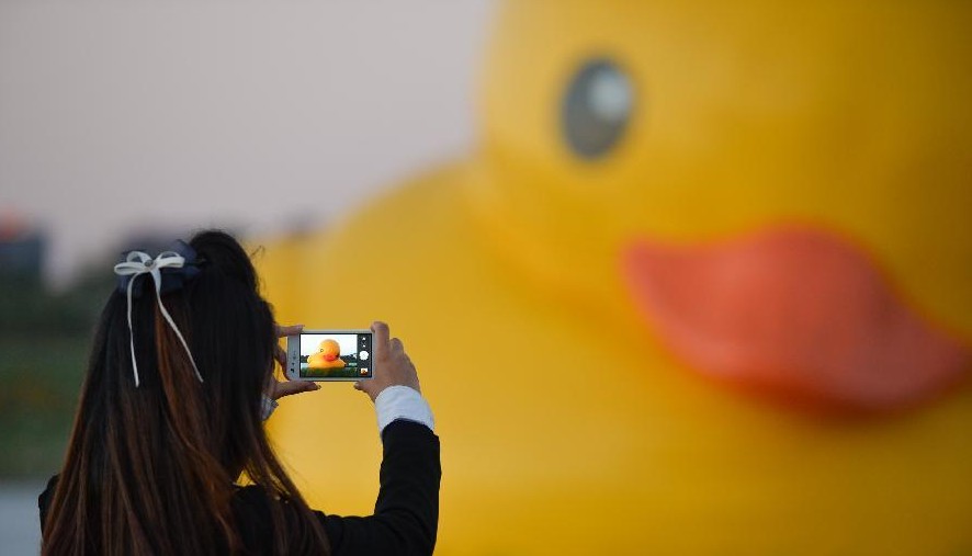 一名园博园的工作人员用手机恋恋不舍的记录下大黄鸭“泄气”过程。9月24日,工作人员正在拆掉给大黄鸭打气的鼓风机。当日下午,园博园游览时间结束,大黄鸭开始“泄气”,结束19天的园博园之旅,吻别园博湖。9月26日,大黄鸭将戏水颐和园昆明湖,再次与公众见面。