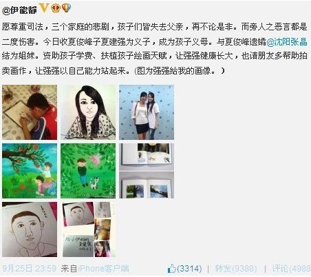 2013年9月25日,据沈阳市中级人民法院官方微博“沈阳中院”消息,经最高人民法院核准,故意杀人罪犯夏俊峰被依法执行死刑。当一切尘埃落定时候,我们常人能做的只是愿他一路走好,可对于夏俊峰的妻子和儿子更多的是同情与怜悯。但最新消息传出伊能静收夏俊峰之子为义子 与其妻结为姐妹,如果是真的这也许是夏先生唯一感到安心的。下面是伊能静的微博。