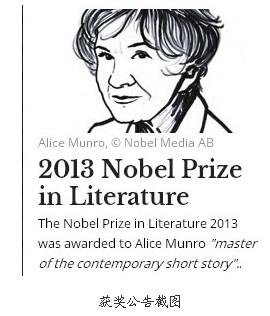 瑞典学院昨晚公布,2013年诺贝尔文学奖授予加拿大知名女作家艾丽斯·芒罗(Alice Munro),颁奖词将门罗介绍为“当代短篇小说大师”。芒罗在接受一家加拿大媒体电话采访时说:“我知道我有赢的希望,但从来没想过会得奖。”瑞典学院永久秘书皮特·英格伦评价道,“短篇小说一直处于长篇小说的阴影中,芒罗选择了这种艺术形式,她将它很好地开垦,接近完美。”