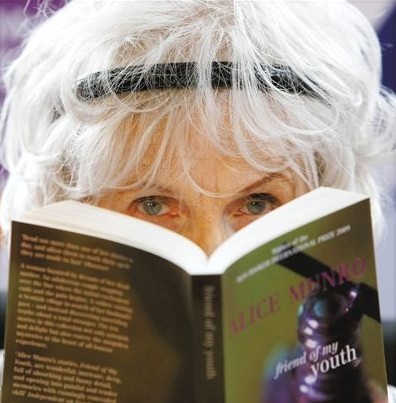 2009年门罗作为该年度布克文学奖得主,在爱尔兰都柏林出席发布会,手拿自己短篇小说集《我年轻时的朋友》。